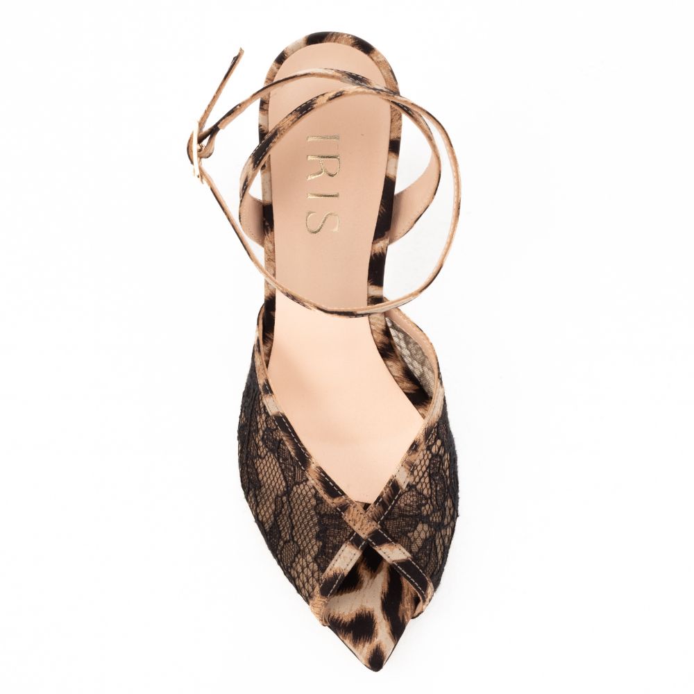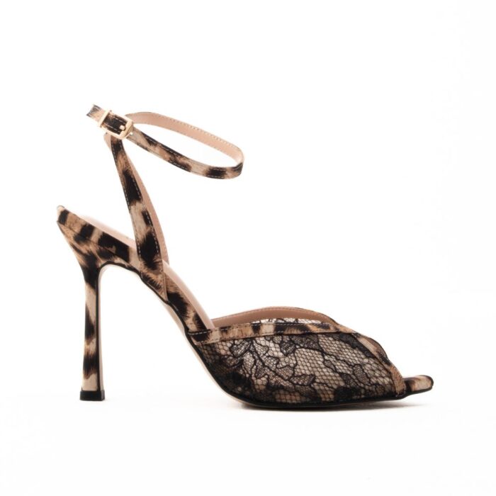πέδιλα δερμάτινα σατέν με δαντέλα και ψηλό τακούνι λεοπάρ