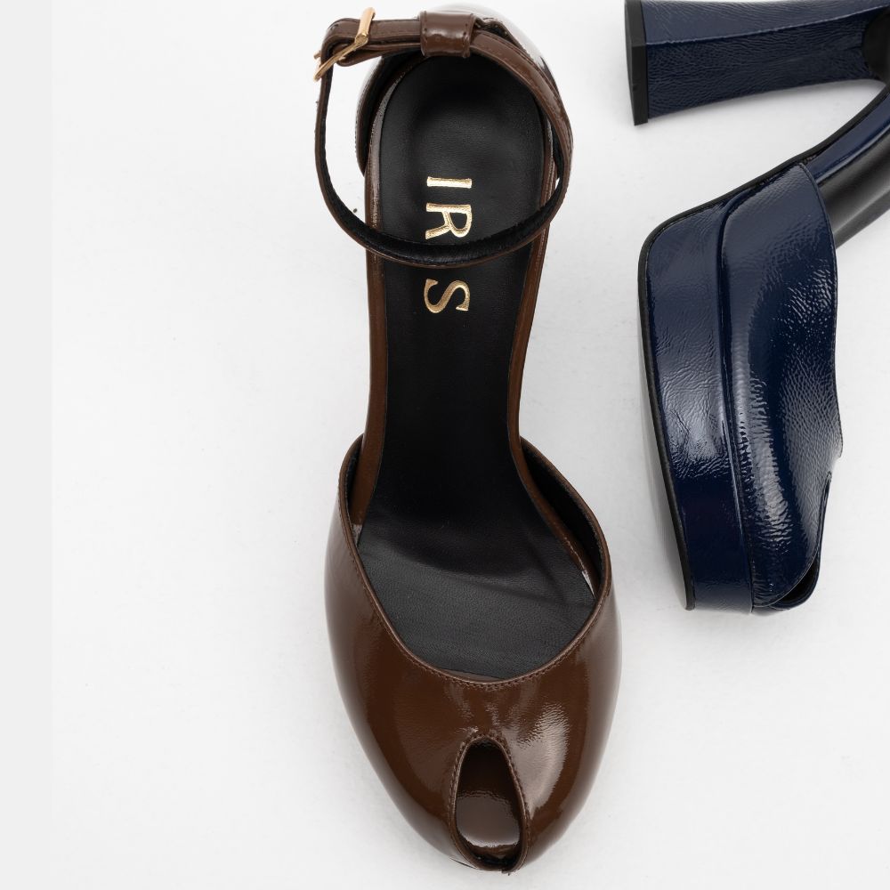 Γόβες peep-toe λουστρίνι, με φιάπα, κλειστή φτέρνα και δέσιμο στον αστράγαλο. Θηλυκό σχέδιο, με άνετη κανονική εφαρμογή, μαλακό δερμάτινο πάτο και πολύ σταθερό τακούνι.