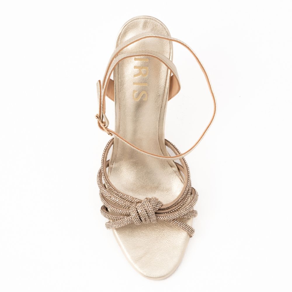 Πέδιλα μεταλλικά δερμάτινα με στρας και εντυπωσικό διακοσμητικό κόμπο. Μαλακός πάτος για άνεση στο περπάτημα. Ένα σχέδιο λαμπερό για επίσημα βραδυνά events και bridal εμφανίσεις.