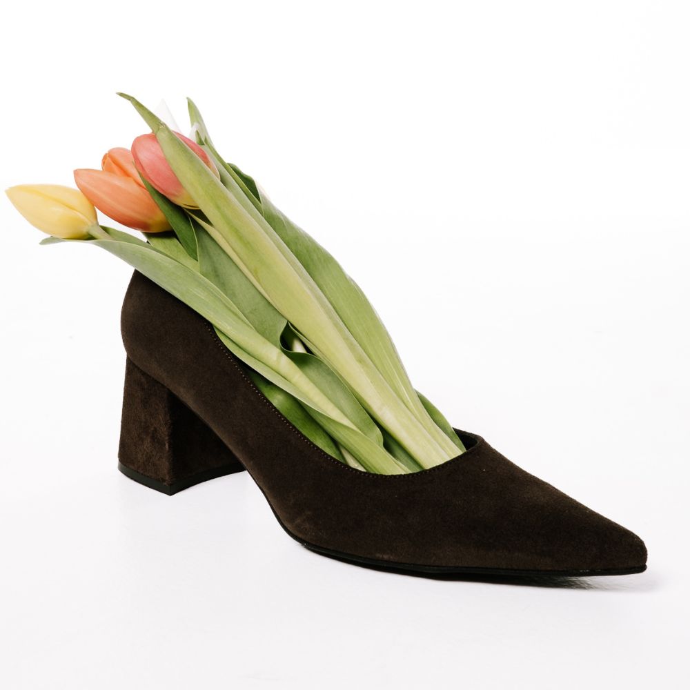 Γόβες δερμάτινες ,καστόρινες με μεσαίο block τακούνι. Πάτος σε μυτερή γραμμή με χοντρό σταθερό τακούνι.