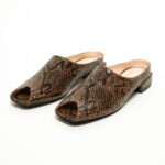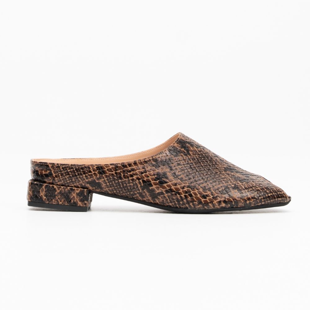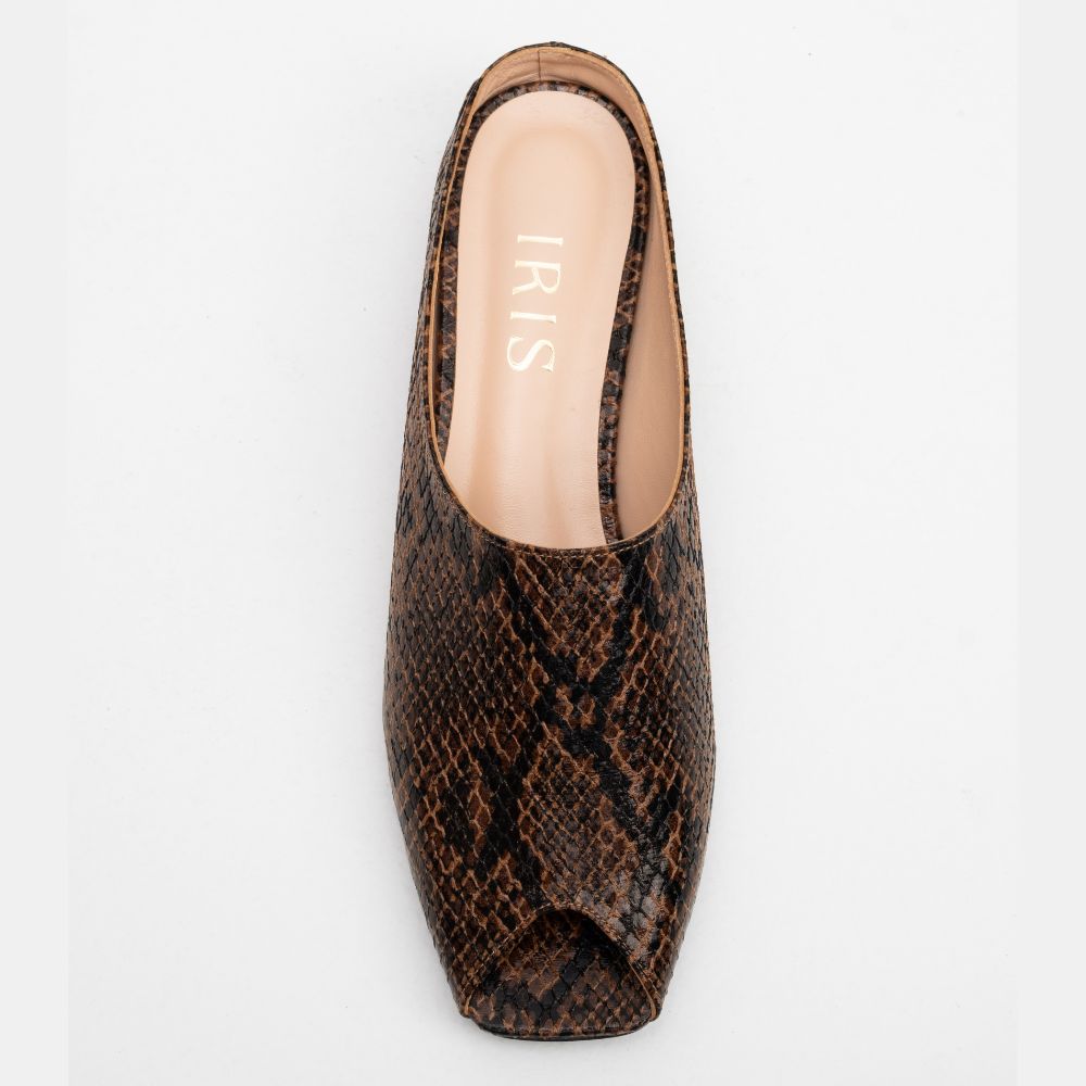 Mules peep-toe δερμάτινα snake. Μαλακός εσωτερικός πάτος, καρέ γραμμή και μοντέρνο φλάτ τακουνάκι. Μία όμορφη παραλαγή του κλασικού mule.